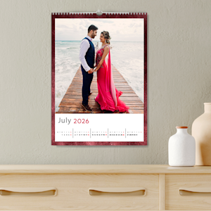 Display your unique pictures or favorite moments with a photo wall calendar. These wall calendars are perfect for your home or office walls and serve as a great family and corporate gift. With our online wall calendar maker, a wide selection of designs, and three size options – you can create a photo calendar that suits your style and space. While designing, you can add text or clipart to mark important dates, including birthdays and anniversaries, company highlights, achievements, milestones, etc. Available in 3 size/format options, these photo wall calendars are designed with a durable spiral binding with crisp full-color photo printing. Upload high-quality photos from your computer and create a desk calendar that appeals to you. For personalized wall calendars for your company, you can add the logo and brand colors for a cohesive appearance.